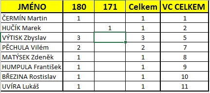 V tomto kole předvedli BINGO tři hráči, všichni 180: Humpula, Březina, Uvíra.